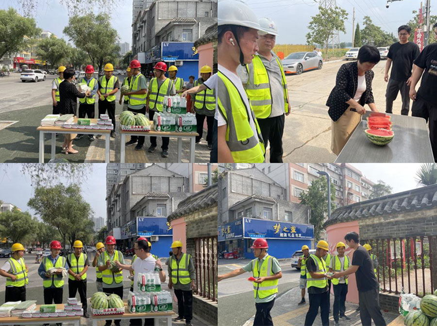 七月的天氣,驕陽似火。露天施工作業(yè)的一線工人體能消耗極大,為切實做好一線工人的防暑降溫工作,關(guān)愛在高溫作業(yè)下的一線施工人員,7月11日上午,洛陽城鄉(xiāng)建設工程有限公司董事長王會娟攜班子成員及河南宏創(chuàng)建設工程有限公司負責人,深入宏創(chuàng)公司項目一線親手把西瓜、礦泉水、藿香正氣液等防暑降溫用品送到工人手中,把關(guān)懷送入工人的心坎。