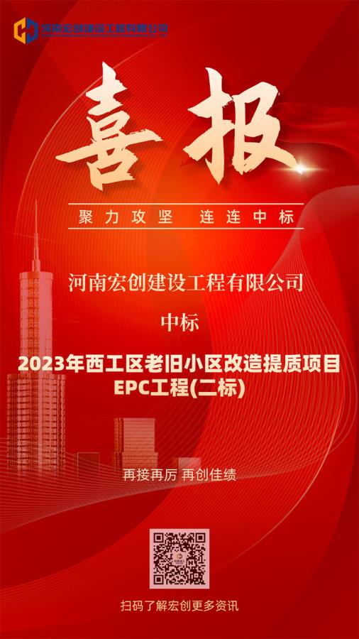 秋風送爽,捷報頻傳!9月13日,河南宏創建設工程有限公司中標2023年西工區老舊小區改造提質項目EPC工程(二標),中標金額3233.23萬元。